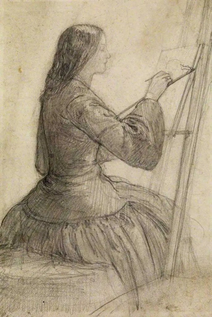 Anche Lizzie continuava a scrivere e dipingere, Rossetti stesso la incoraggiò e le diede lezioni. Fu l’unica pittrice donna inclusa nella mostra preraffaellita del 1857.